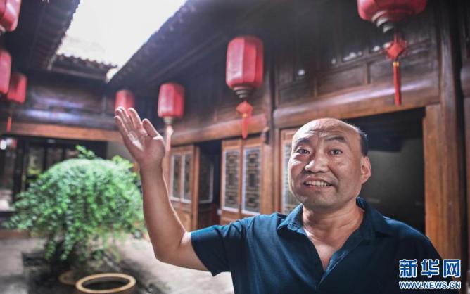 凤凰镇老街四合院的主人李宝牛向游客介绍老屋结构(9月11日摄)。他家的长盛祥农家乐铺面宽不盈丈,宅院深深却高达三四十米,据说铺面的间数和房屋的纵深度都代表了当时主人的富裕程度。