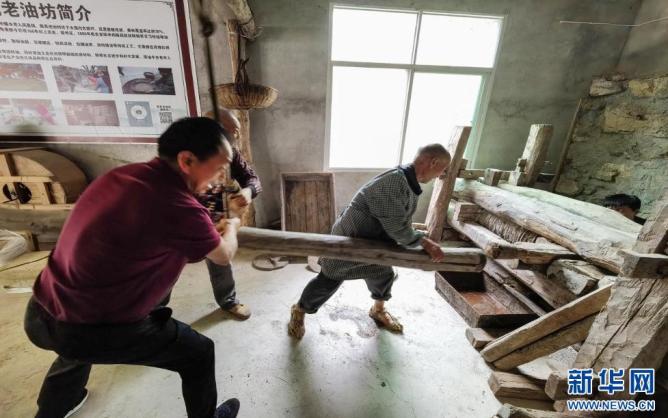 凤凰镇陈氏木榨榨油坊正在榨油(9月12日摄)。2019年3月木榨榨油技艺被收入商洛市第三掇非物质文化遗产名录。