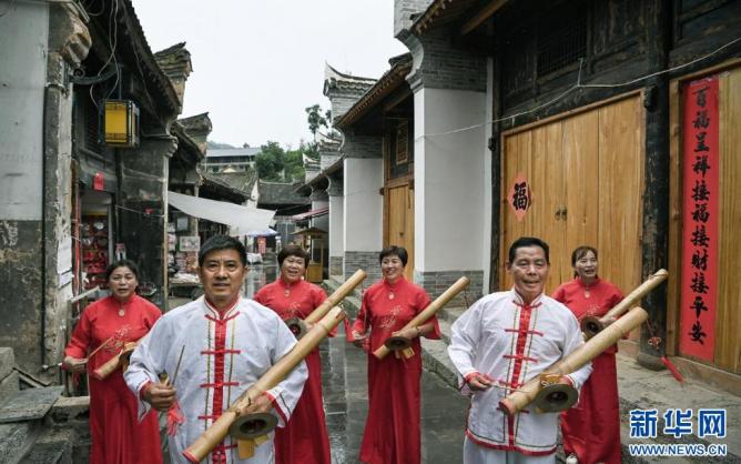 凤凰镇渔鼓演艺社王义德(前左)等爱好者在古街演出柞水渔鼓曲艺(9月11日摄)。凤凰镇独特的地理位置,形成了南北交融又不失地方特色的地域文化、民俗文化、音乐文化,柞水渔鼓最为兴盛,逢年过节,红白喜事,丰收庆贺,农闲之时均以此为乐。