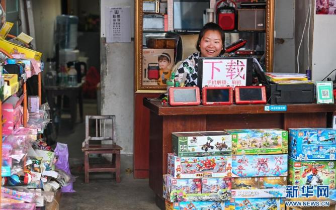 店员邓婷在为顾客下载资料(9月11日摄)。古街上为民服务的小商店,不仅出售各种与时代同步的玩具,还代为客人下载音乐及各种资料。