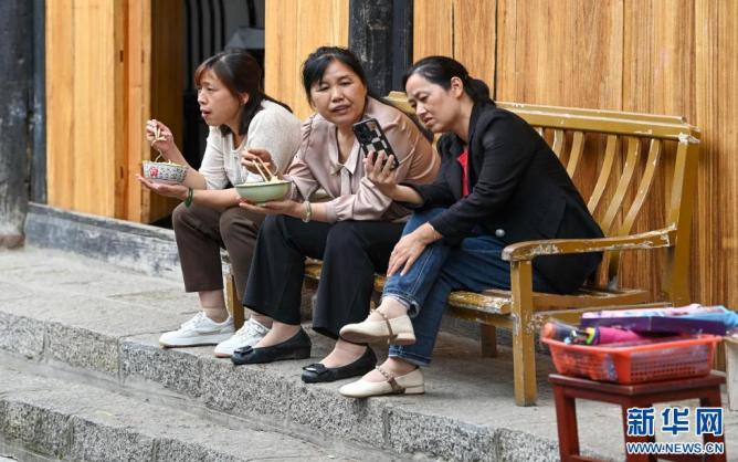 居民在一起吃饭聊天(9月11日摄)。左邻右舍可以倚门聊天,孩子可以在街上玩耍,虽然静谧但也极富生活的韵味。