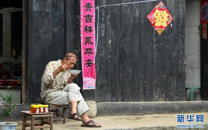 凤凰镇老街上的居民一边吃饭,一边守着出售土特产的小摊(9月11日摄)。