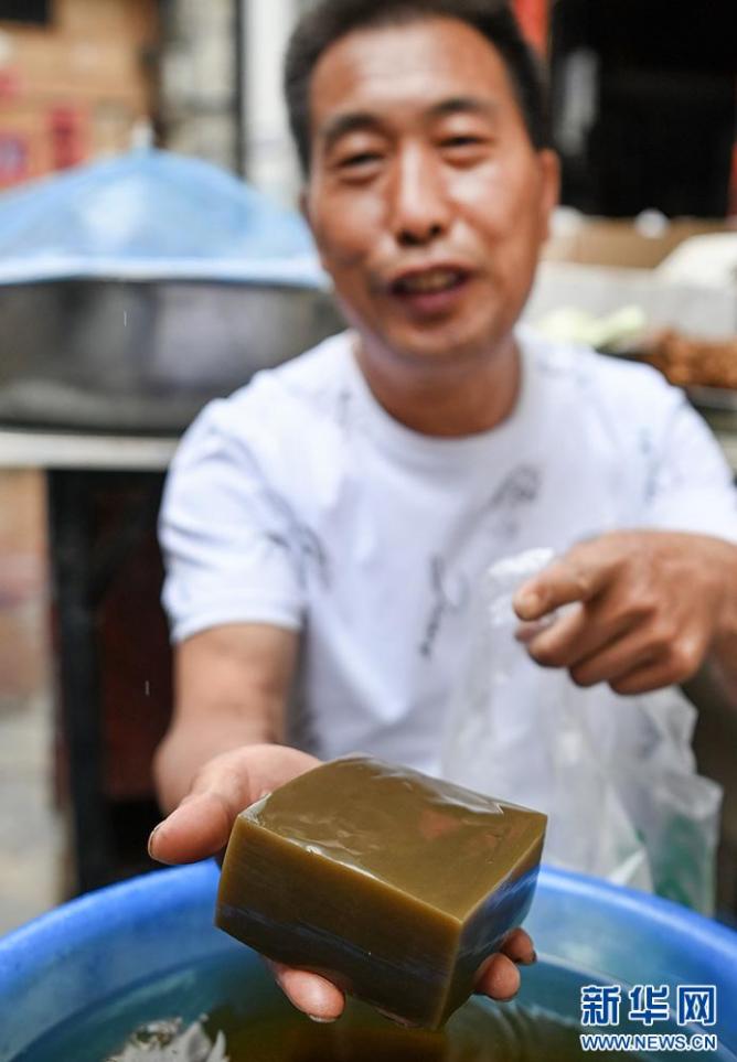 凤凰镇老街的土特产店汪老三在向游人推销他的“神仙豆腐”(9月11日摄)。神仙豆腐是凤凰镇一道特色传统小吃,是吃到嘴里凉丝丝、苦茵茵的绿色食品。