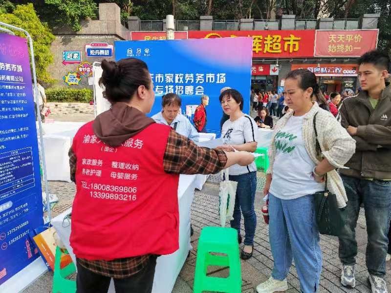 保洁员、育婴师、月嫂、养老护理员......10月16日,重庆市家政劳务市场秋季专场招聘活动在江北区石马河街道桂花园社区开市。渝家人、百龄帮等30余家企业,携近1100个家政类岗位,热情地向求职者抛出“橄榄枝”。