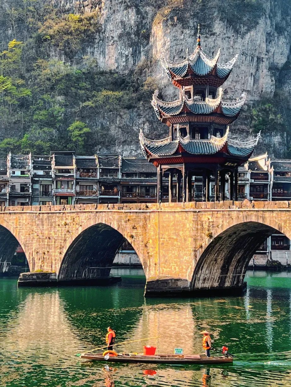 斑驳的石板路、缓缓流淌的㵲阳河、贴崖而建的“中国三大悬空寺”之一的青龙洞古建筑群,以及那些藏匿于深巷中的古民居,都在诉说着镇远古城千年光阴的故事。