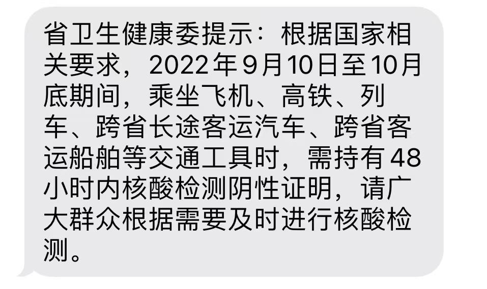 据陕西省卫健委短信提示,根据国家相关要求,2022年9月10日至10月底期间,乘坐飞机、高铁、列车、跨省长途客运汽车、跨省客运船舶等交通工具时,需持有48小时内核酸检测阴性证明,请广大群众根据需要及时进行核酸检测。