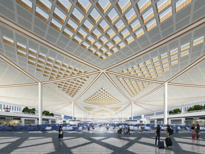 西安东站站房以“秦山渭水、丝路长安”为设计理念,建筑总规模39.4万平方米,站房布局为线上高架候车及侧式站房,采用“上进下出、腰部进站”的客运流线。