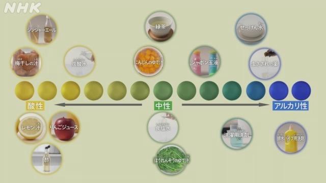 水の色をかえたのは、BTB溶液(ようえき)。色の変化(へんか)で液体の性質(せいしつ)を教えてくれます。たとえば、炭酸水(たんさんすい)に入れると黄色にかわります。これは、酸性(さんせい)。スーッとする虫さされの薬は、青色になりました。アルカリ性です。食塩水(しょくえんすい)は、緑色に。中性です。酸性、中性、アルカリ性。3つの色が、3つの性質をしめしています。黄色がこいほど酸性の度合いが強く、青がこいほどアルカリ性の度合いが強い。そのあいだが中性です。