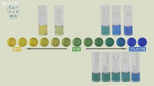 海と川は、青。水道水は、うすい青。水槽(すいそう)の水は、少し酸性。雨は黄色、酸性です。酸性から中性、アルカリ性。水にもさまざまな性質があるんですね。