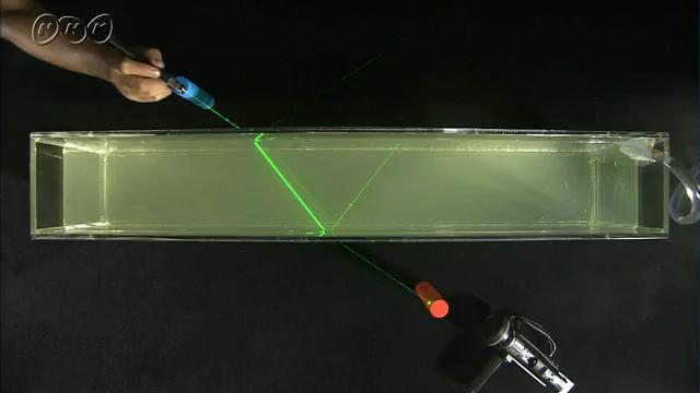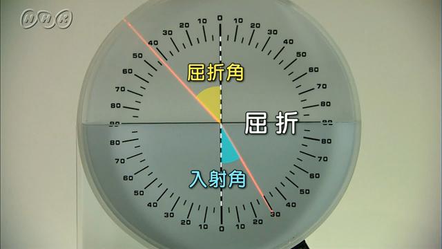 水があると、光はどう進むのでしょうか。円形の水槽に水を半分入れ、光の進み方を調べます。光はレーザー光を使います。真下から光を入れると、光は水面を真っ直ぐ通って出ていきます。水面に対して光を当てる角度を変えると、水面から出るときに光が曲がりました。水と空気の境い目で進む方向を変えるのです。これを「屈折」といいます。さらに角度を大きくすると、光が屈折する角度も大きくなります。屈折した光が水面に近づくと、どうなるのでしょう。水面を通り抜けず、境い目ですべての光が反射しました。これを「全反射」といいます。
