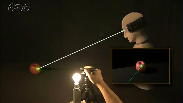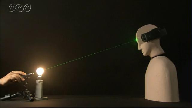 目で物を見るというのは、どういうことでしょう。昼間、外の物が見えるのは、太陽の光が届いているため。暗いところで物が見えるのは、電灯などの光があるためです。太陽や電灯のように、自ら光を出すもののことを「光源(こうげん)」といいます。光源から出た光はどのようにして目に届くのでしょうか。人形の目の位置にカメラを置いて調べます。光の通り道を、レーザー光を使って見てみましょう。光は光源からさまざまな方向に出ています。そのなかの一部が、真っ直ぐ目に届くのです。