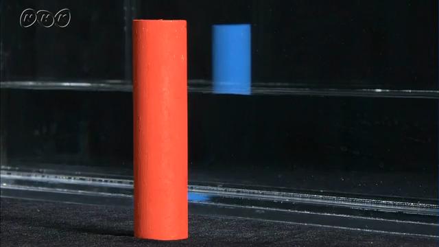 からの水槽をはさんで、手前に赤い柱、向こう側に青い柱があります。赤い柱と青い柱がすぐ横に並んで見える位置にカメラを置きます。水槽に水を入れていくと、カメラからはどう見えるのでしょうか。水位が上がるにつれて、青い柱が消えていきます。どうしてでしょう。