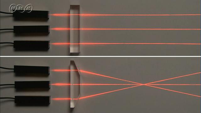 形の違う2枚の透明なアクリル。これに平行な光を当てると、光はどのように進むのでしょうか。まず、両面が平行なアクリルに3本の光を当てると、光はそのまま平行に進みます。次は片方を3面に削ったアクリル。斜めの面で光が屈折し、平行だった3本の光が1点で交差しました。では、斜めの面を増やしていくとどうなるのでしょう。片方が曲面になったアクリルです。やはり3本の光が1点で交差しました。このような形のものを「凸レンズ」といいます。凸レンズは、物を大きくして見る虫眼鏡などに使われています。