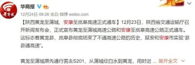 2020年12月23日,安康至岚皋高速公路正式通车,岚皋县告别没有高速公路的历史,安康市实现“县县通高速”目标;同一天,蒲城至黄龙高速公路通车,黄龙县告别没有高速公路的历史,革命老区延安市实现“县县通高速”目标。