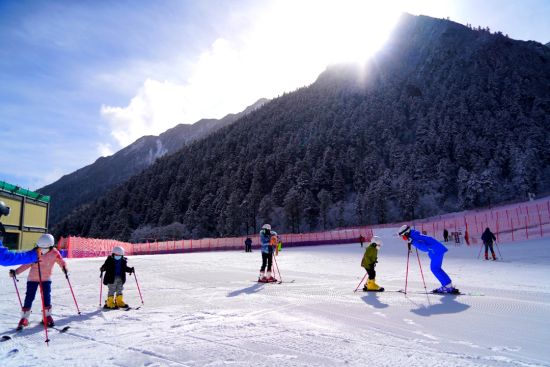 值得一提的是,作为第一个面向贡嘎的滑雪场,王岗坪贡嘎滑雪场海拔仅2400米,大部分人都能轻松适应,对小孩子更是非常友好。且王岗坪处于干热河谷气候,冬季日照较强,晴朗的午后温度可达27℃,让穿着短袖滑雪变得可能。
