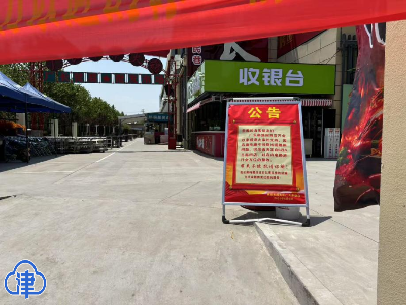 6月11日,津云新闻记者在现场看到,李女士所说的“厂长烧烤”,就在航空四路与创业路交会处。烧烤店院内挂着条幅,摆放着开业用的花篮。院门口摆放的一则公告显示,因店面电路不间断出现跳闸问题,烧烤店于6月6日起闭店,对店内电路进行全方位整改。