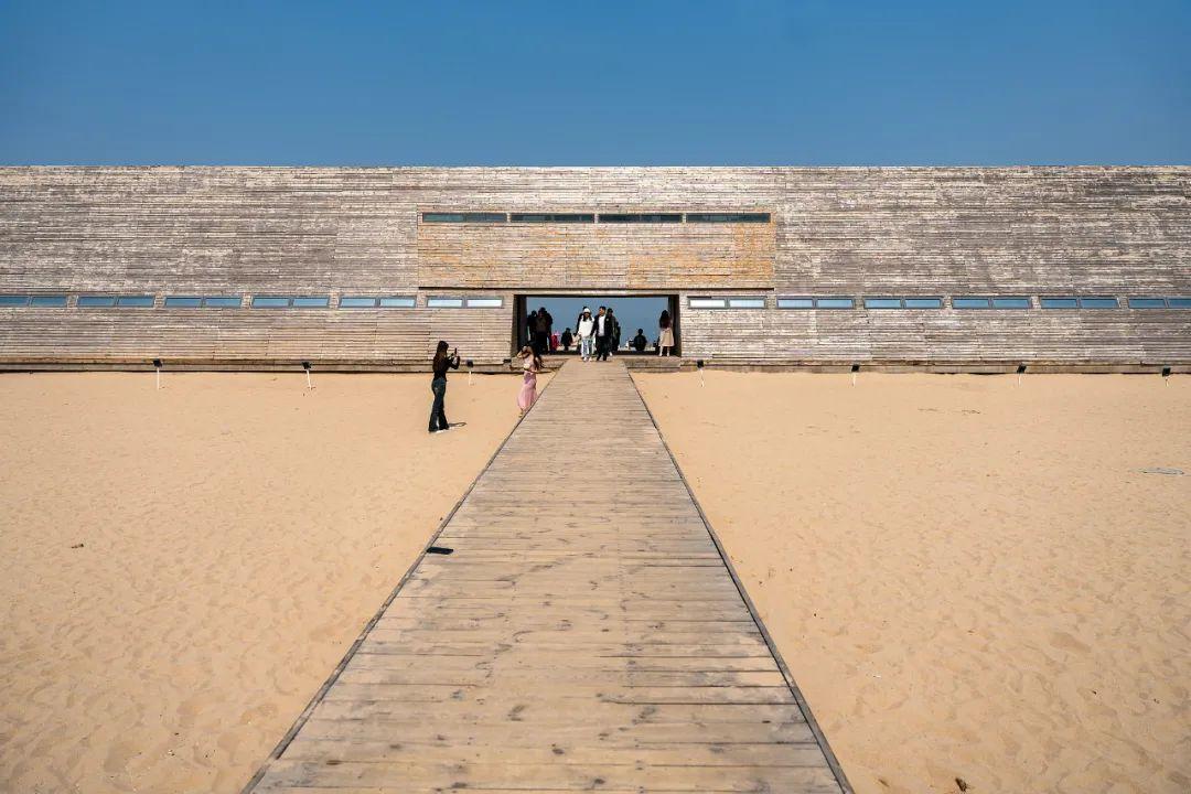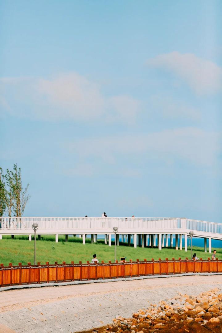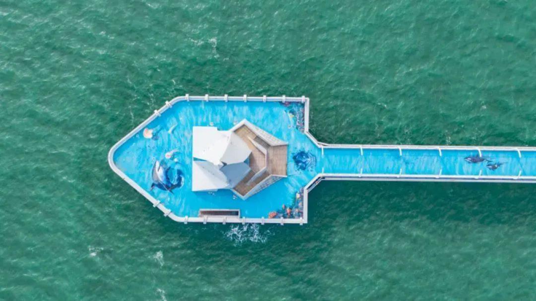 不远处就是深蓝之光栈桥,它的桥身向上伸出两排洁白的钢铁长臂,如通往海洋深处的神秘通道。在此打卡拍照,可以留下一段关于海洋与建筑的浪漫时光。