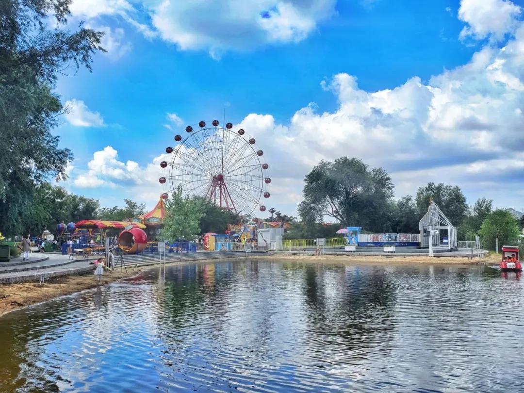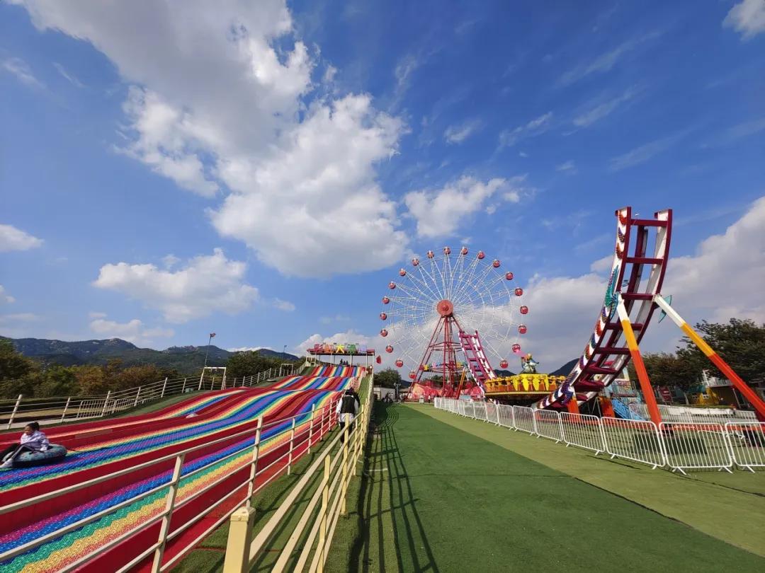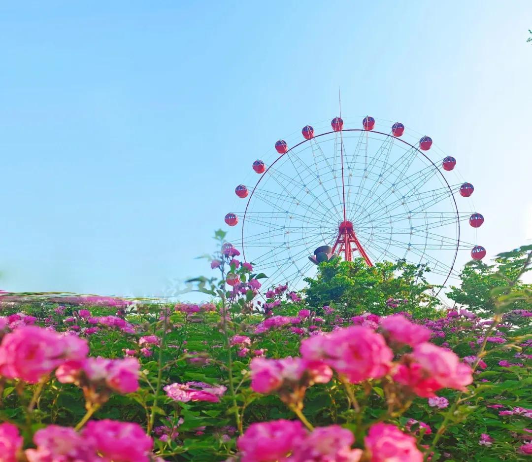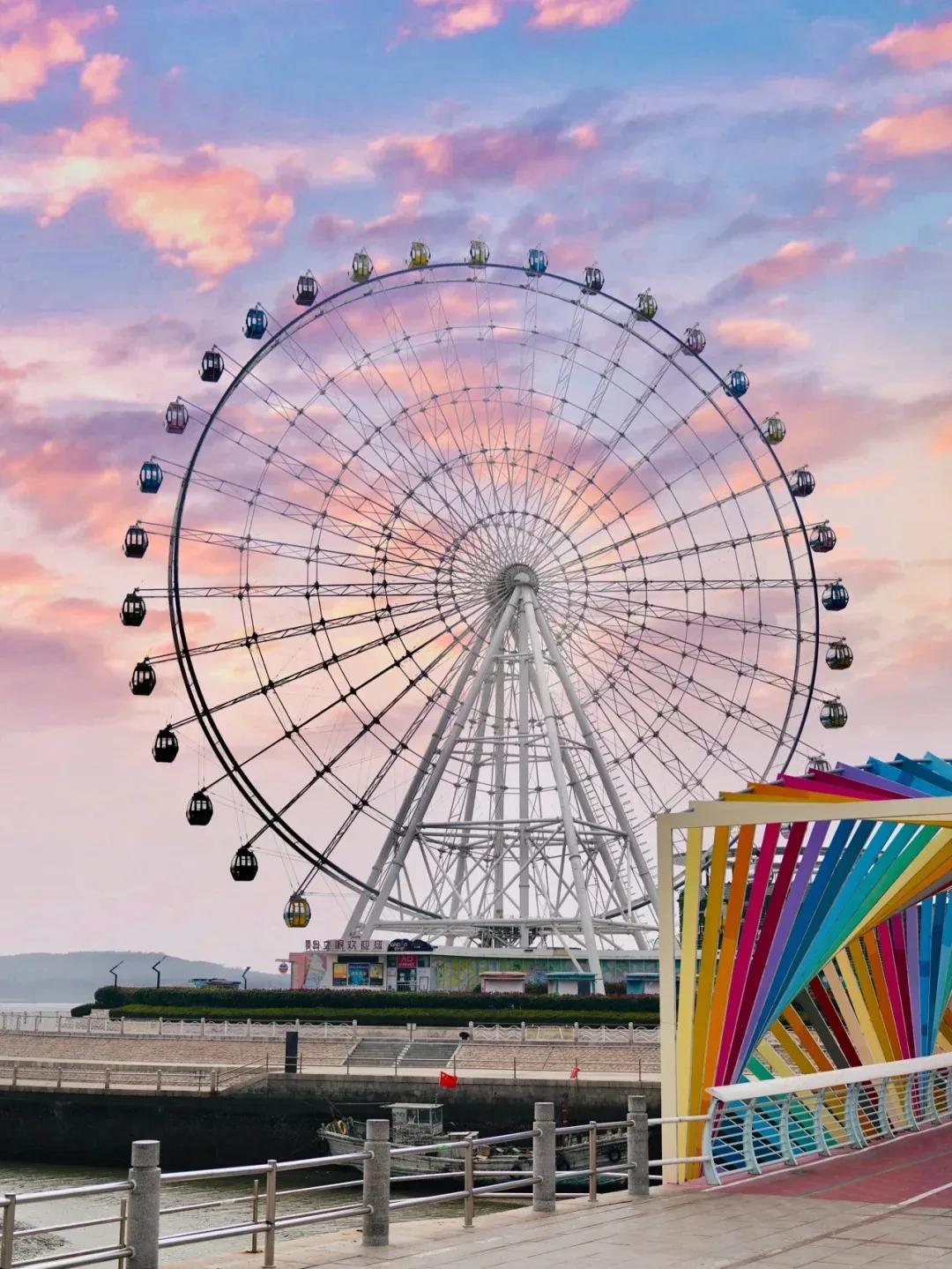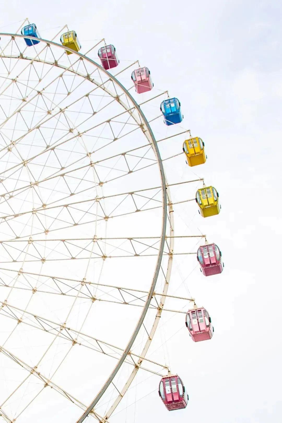 湛蓝的天空之下,红白相间的摩天轮绚烂夺目,色彩的激烈碰撞,活泼醒目,打卡拍照都是一绝。