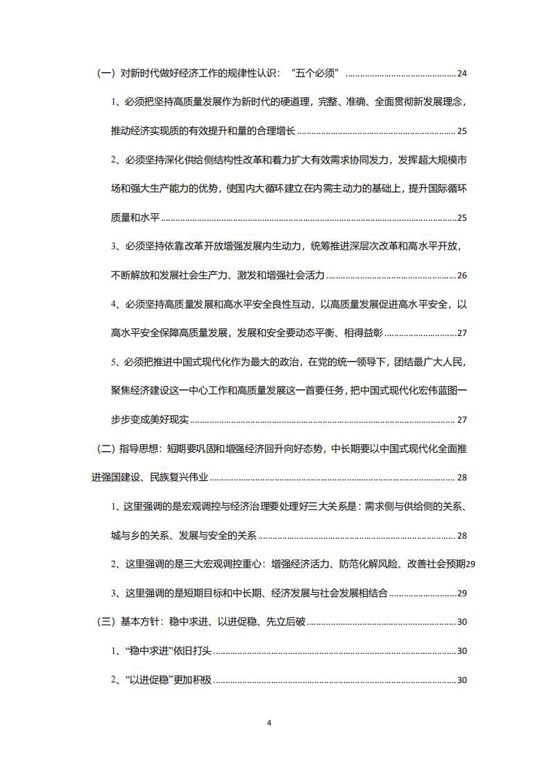 会议强调,做好明年经济工作,要以习近平新时代中国特色社会主义思想为指导,全面贯彻落实党的二十大和二十届二中全会精神,坚持稳中求进工作总基调,完整、准确、全面贯彻新发展理念,加快构建新发展格局,着力推动高质量发展,全面深化改革开放,推动高水平科技自立自强,加大宏观调控力度,统筹扩大内需和深化供给侧结构性改革,统筹新型城镇化和乡村全面振兴,统筹高质量发展和高水平安全,切实增强经济活力、防范化解风险、改善社会预期,巩固和增强经济回升向好态势,持续推动经济实现质的有效提升和量的合理增长,增进民生福祉,保持社会稳定,以中国式现代化全面推进强国建设、民族复兴伟业。