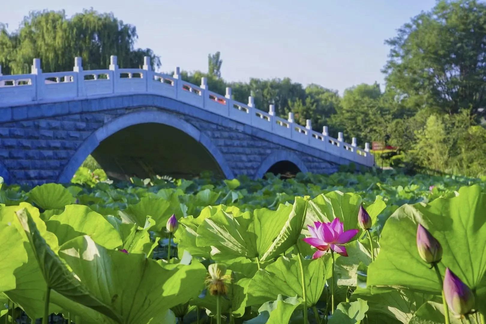 此时的鲜花港荷花开满园中湖泊,仿佛是大地展开的绚丽画卷。与之争艳的还有月季和虞美人。