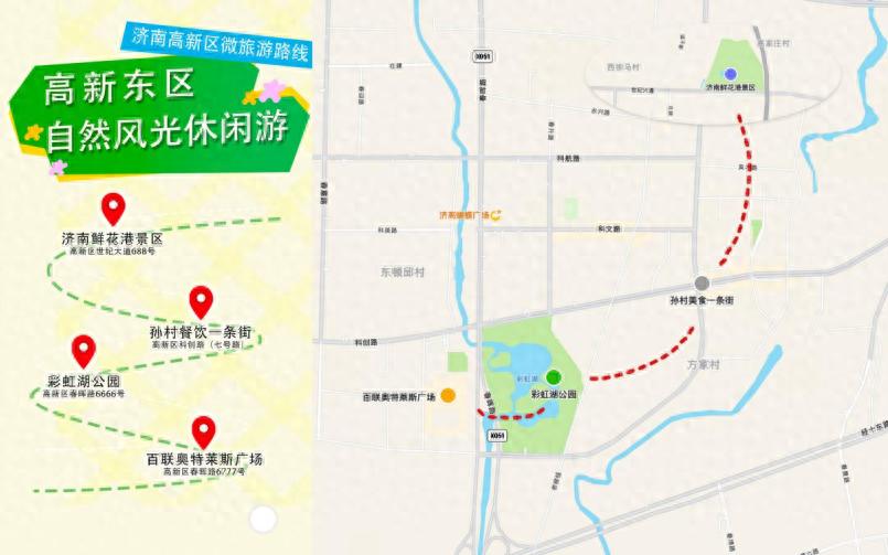 推荐游玩路线:济南鲜花港景区→孙村美食一条街→彩虹湖公园→百联奥特莱斯