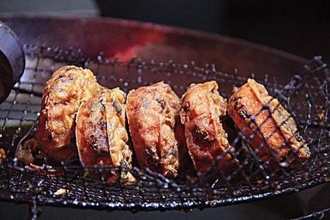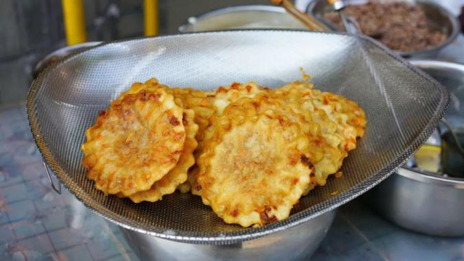 黔西南兴仁市名小吃,用本地米、安龙米和一种香米搭配黄豆、鸡蛋调制米浆,在圆模铁盒里舀上米浆,中间夹放鲜猪肉与葱花等佐料,放入油锅里炸至外表金黄,吃时浇上辣椒水,口感脆香。