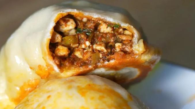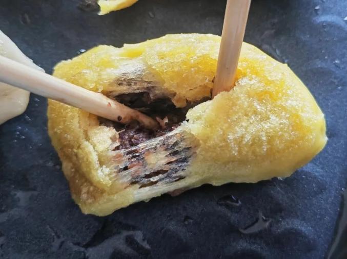 黔西特色,糍粑里不仅包豆腐,还有炒制过的大头菜、肉沫、辣椒等。豆腐需用盐腌制,在锅上烙至内部化汤,是一道包了糍粑外壳的 “大菜” 。