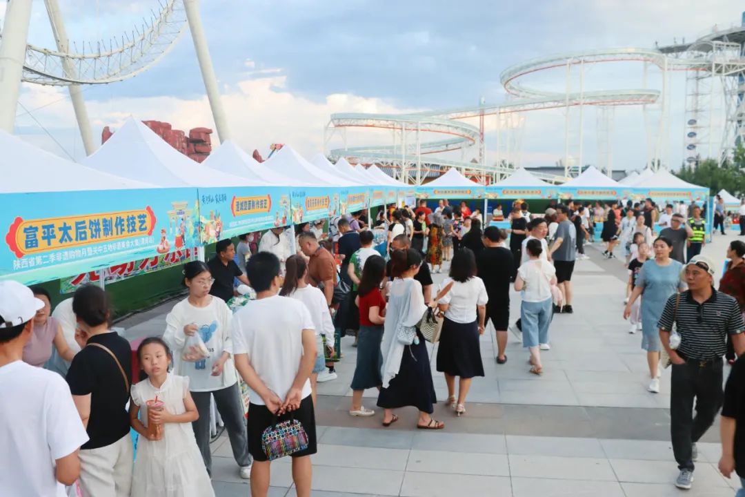 6月28日,“黄河华山 家在渭南”陕西省第二季非遗购物月暨关中五地非遗美食大集(渭南站)在富平县中华郡文化旅游景区隆重开幕。本次活动以非遗展演、美食品鉴为核心,汇聚关中五地非遗精华,为市民和游客奉上一场视听与味觉的双重盛宴。 现场,市民游客三俩结伴,争相品尝富平太后饼、澄城旋面、咸阳荞麦饸络、岐山擀面皮等40多种非遗美食,用舌尖感受关中饮食文化的独特魅力。