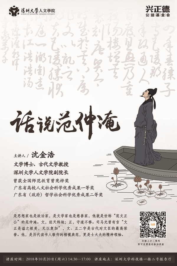 范仲淹,字希文,北宋杰出的思想家、政治家、文学家。范仲淹政绩卓著,文学成就突出,他倡导的“先天下之忧而忧,后天下之乐而乐”思想和仁人志士节操,对后世影响深远。本次讲座,深圳大学沈金浩教授将为我们详细解读历史上的范仲淹。