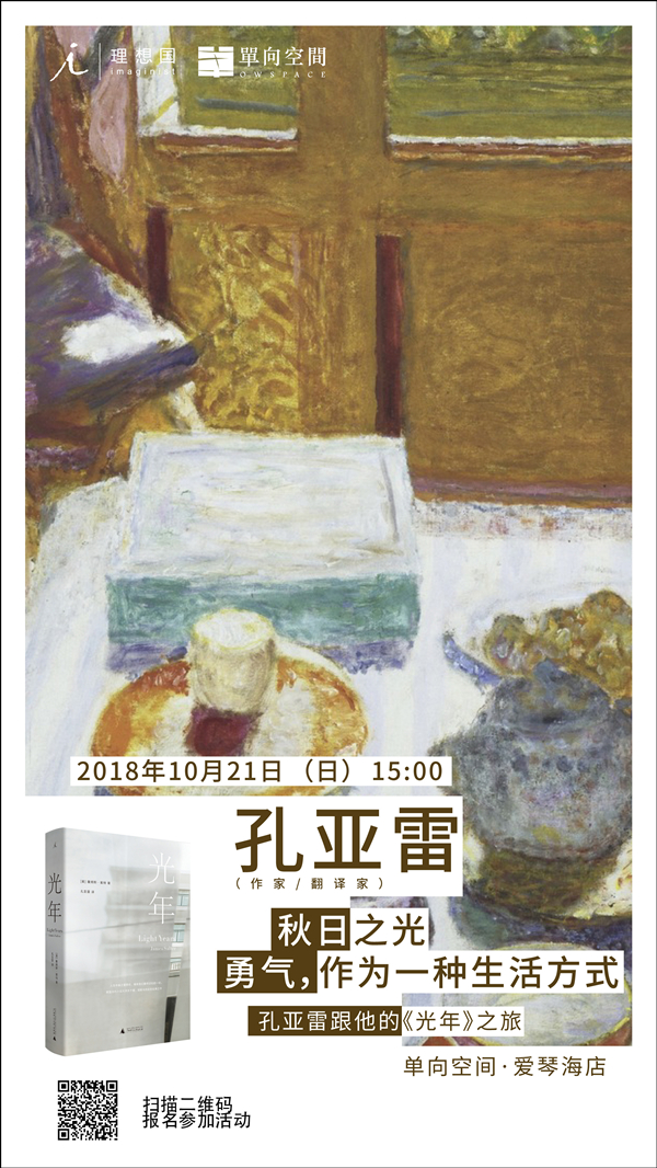 10月21号的周日下午,我们邀请孔亚雷做客单向空间,在“秋日之光”与大家一起分享他的《光年》之旅,以及小说里的那个难以言喻的、关于生命的、关于生活的秘密。