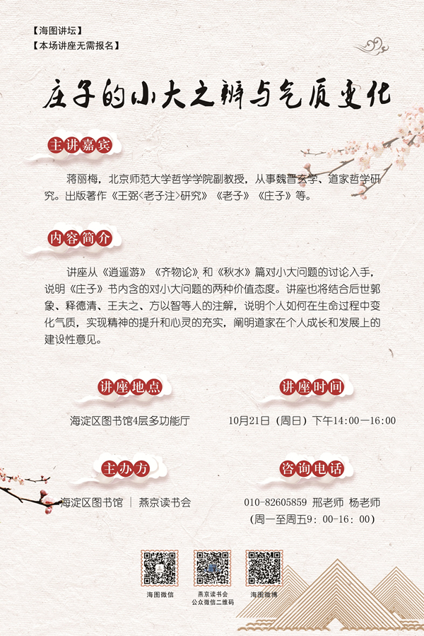 讲座从《逍遥游》、《齐物论》和《秋水》篇对小大问题的讨论入手,说明《庄子》内含的对小大问题的两种价值态度。讲座也将结合后世郭象、释德清、王夫之、方以智等人的注解,说明个人如何在生命过程中变化气质,实现精神的提升和心灵的充实,阐明道家在个人成长和发展上的建设性意见。