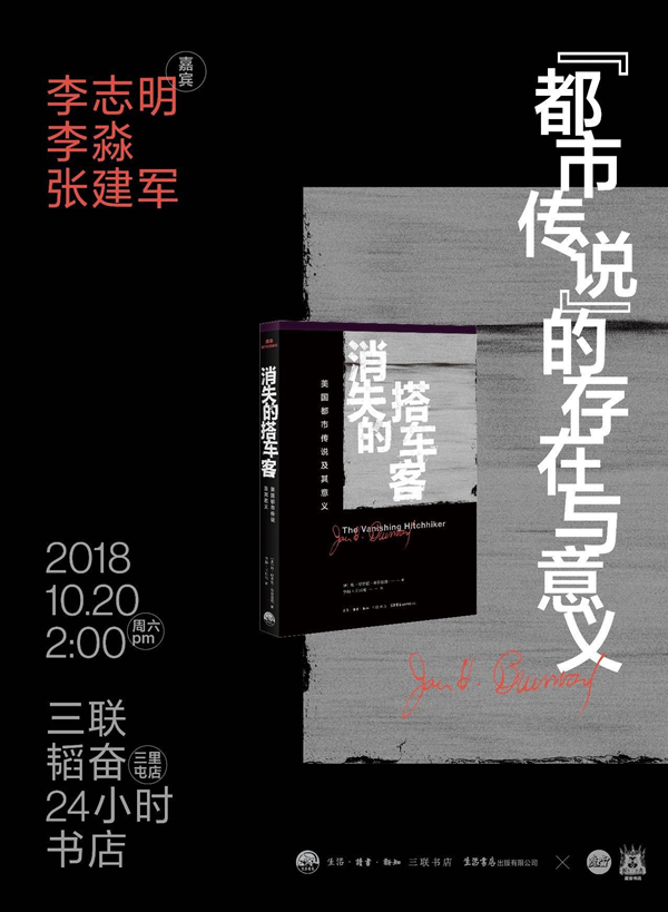 近日,出版过口碑销量佳作《北洋夜行记》、《夜行实录》的北京魔宙文化传媒有限公司携手三联生活书店,共同引进出版了布鲁范德教授的代表作《消失的搭车客》,并在本周六特别邀请了李志明、李淼、张建军三位嘉宾做客三联韬奋24小时书店(三里屯店),与各位热衷于都市传说及民俗学研究的读者,一起聊聊当代生活中那些被广泛传播,并且频繁成为图书、影视、游戏等媒介素材的都市传说故事,以及这些故事背后的复杂成因。