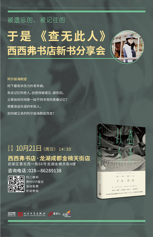 父辈如何对待那一段不同寻常的青春记忆?想要浪迹天涯的年轻人,如何被父亲的阿尔兹海默症改变?10月21日,作家于是将携新书与读者探讨时下最有杀伤力的老年病,阿尔兹海默症。