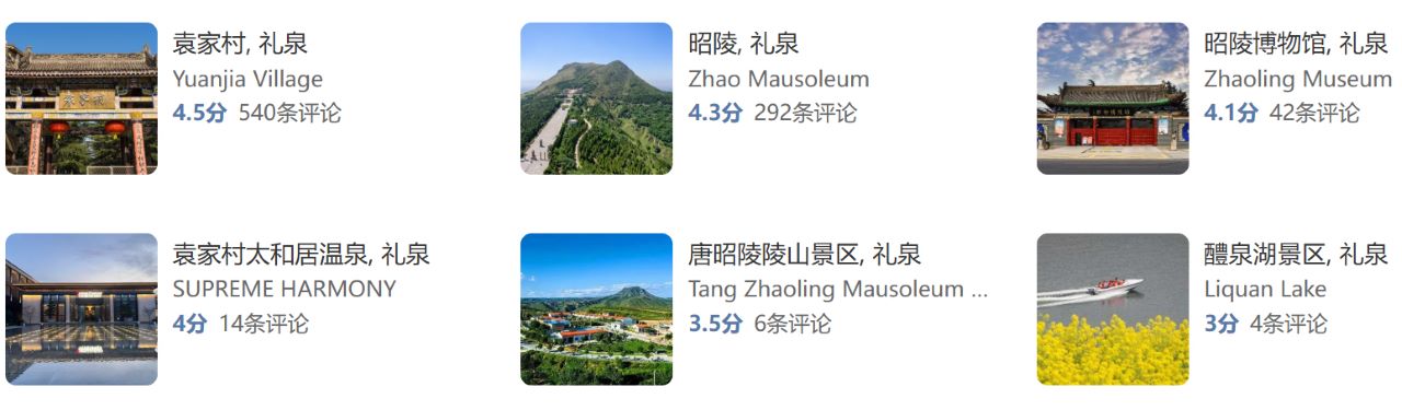 ② 县城:礼泉海螺湾大酒店、九嵕山国际酒店。