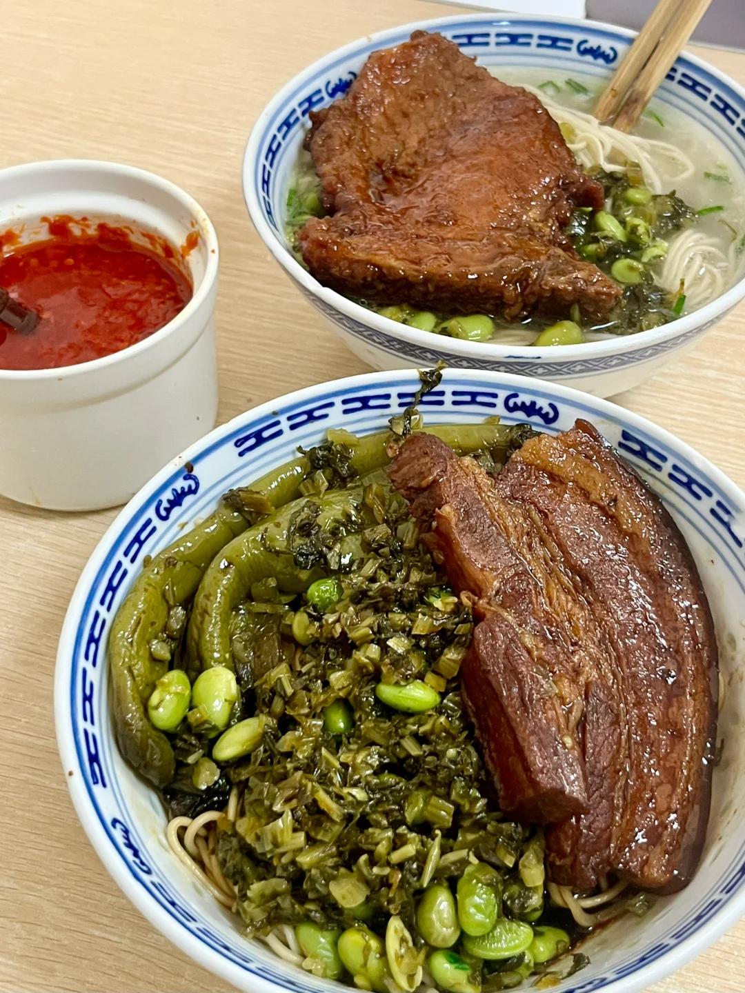 一家老字号面馆,面分别是干拌、红汤、白汤的做法,配菜明档一目了然。