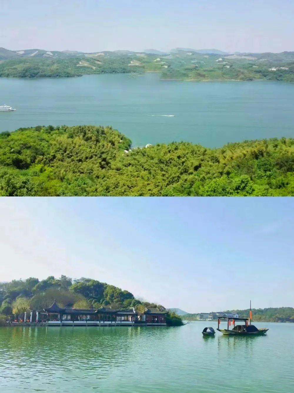在两山夹持,翠竹环绕间,天目湖就像是一颗闪烁的“江南明珠”,点点岛屿散落,片片湖岸蜿蜒,带着几分清幽和诗意。