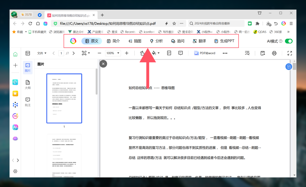 打开PDF文档时,支持简介、脑图、重点、分析、追问、翻译、生成PPT等7项AI能力。