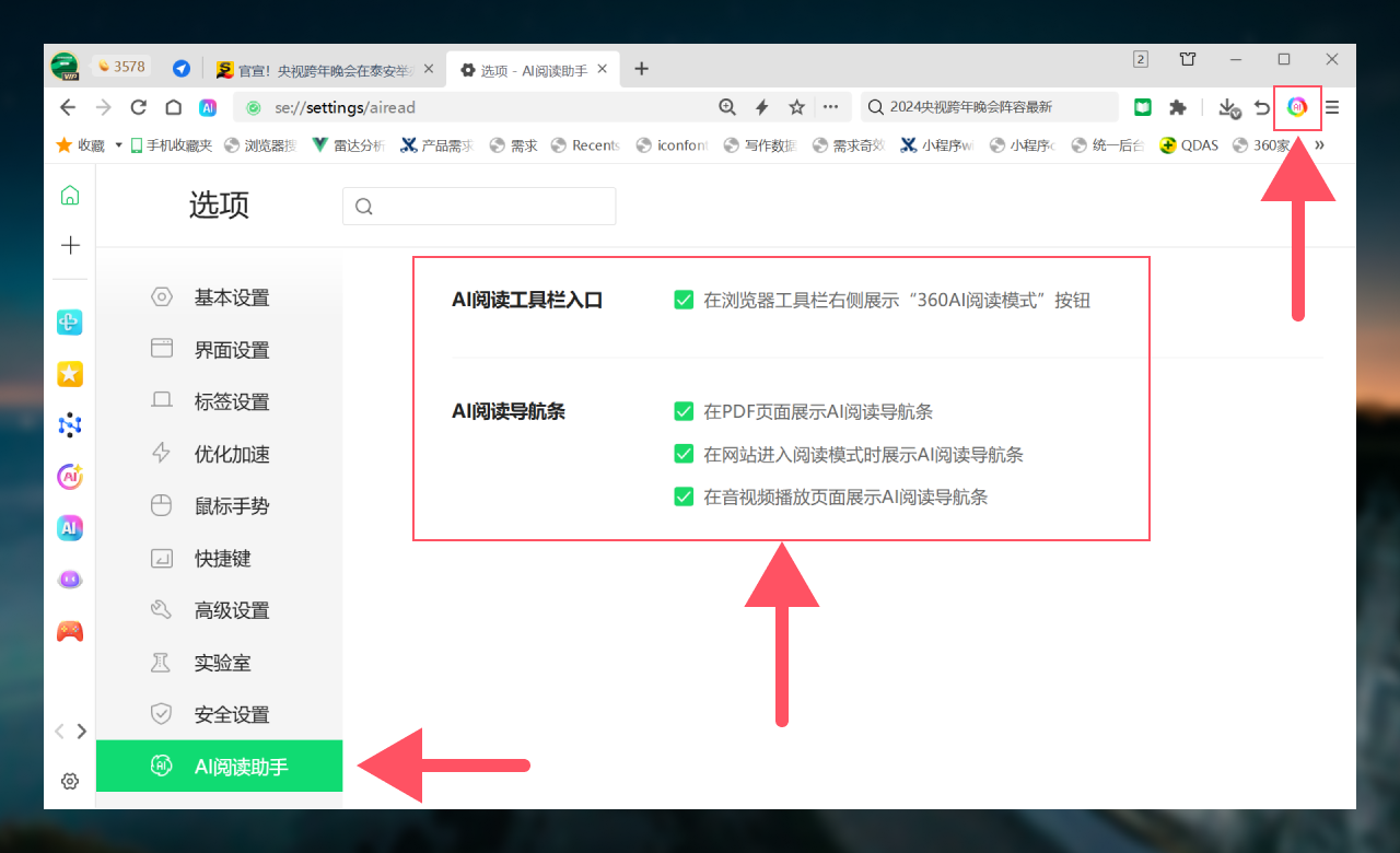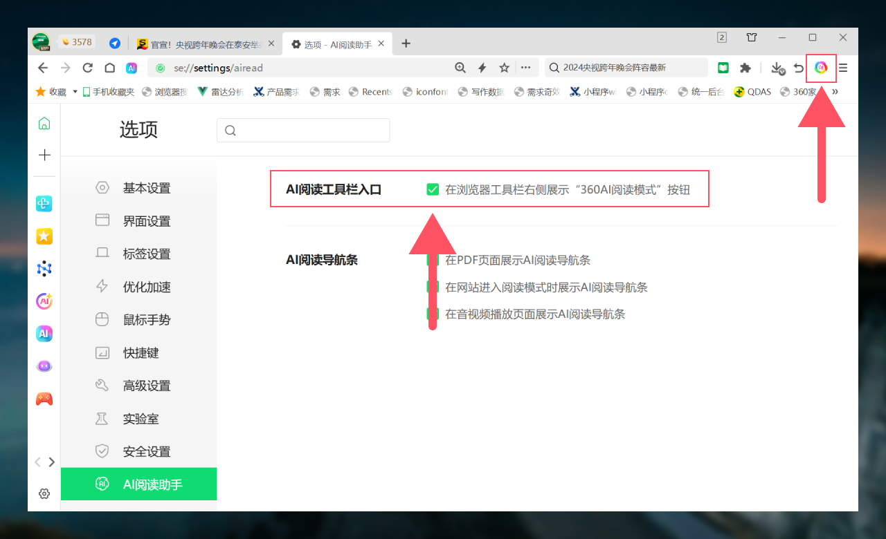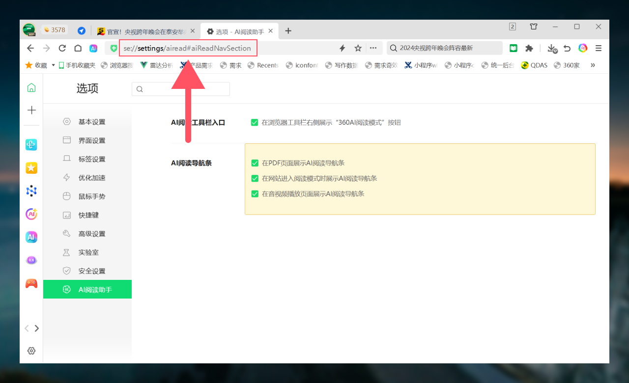 在地址栏输入 “se://settings/airead#aiReadNavSection” 快速进入设置 “AI 阅读工具栏” 页面,可对 AI 阅读的相关设置进行调整。