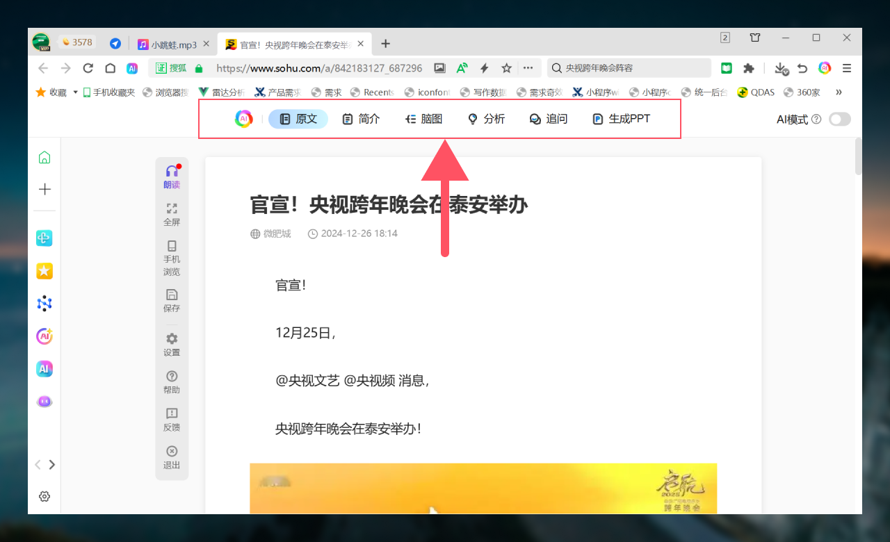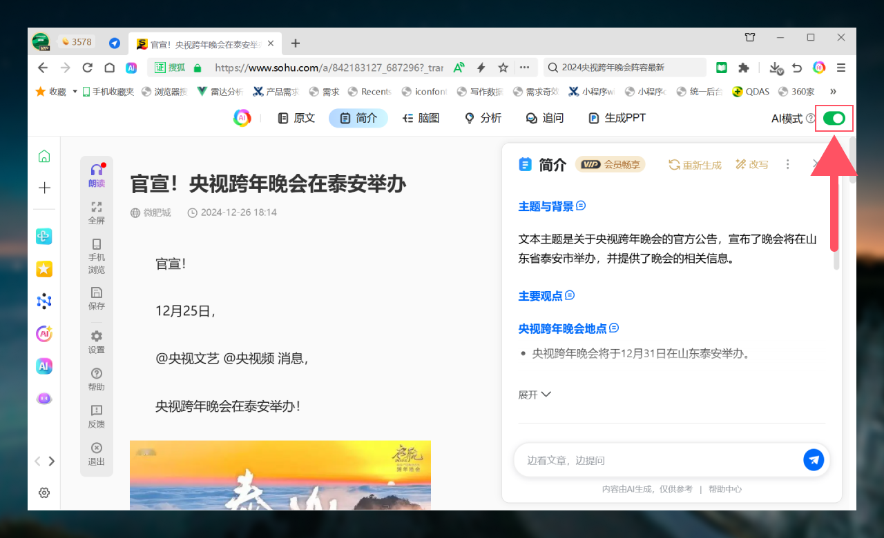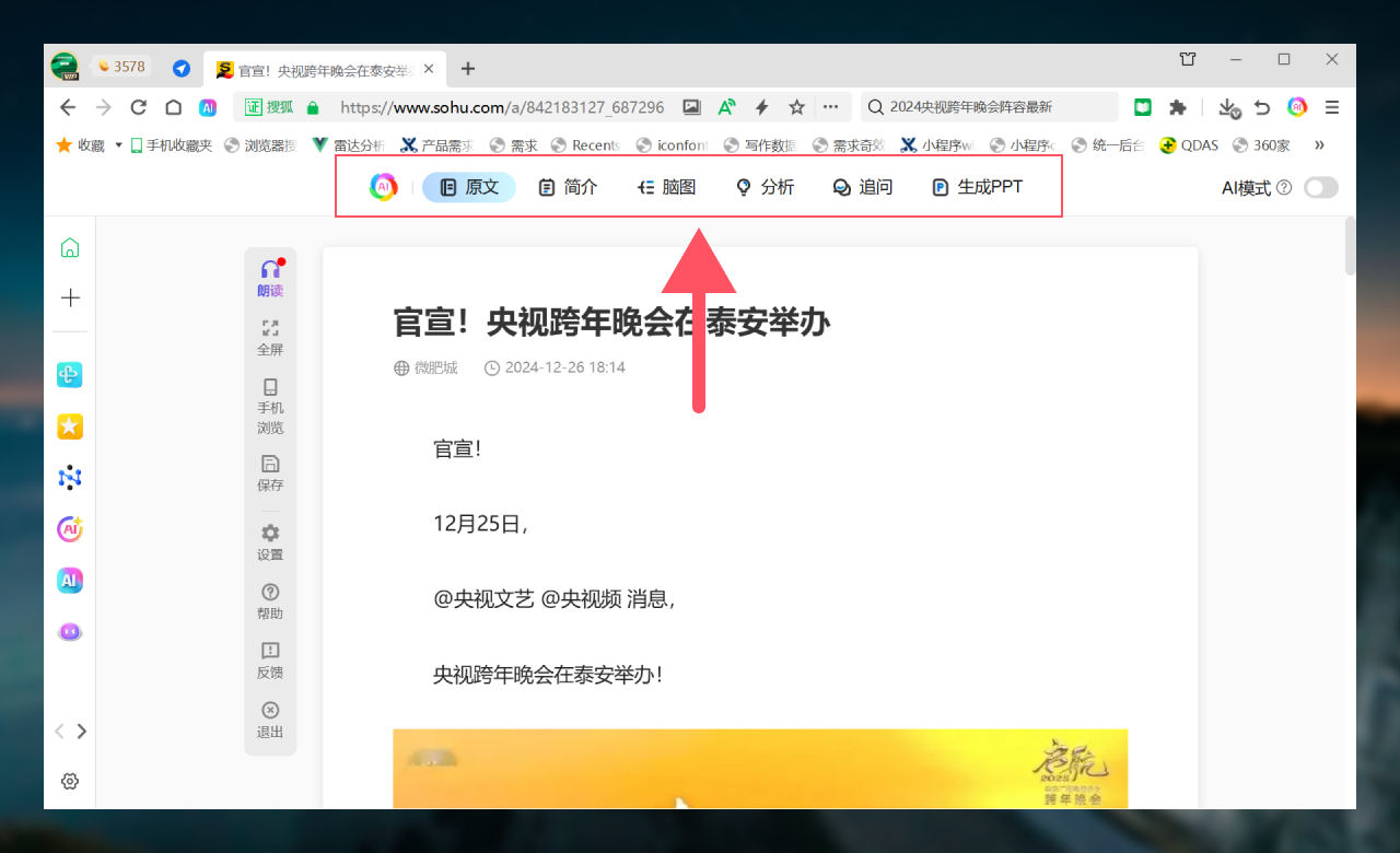 网页进入阅读模式后,支持简介、脑图、重点、分析、追问、生成PPT等6项AI能力。