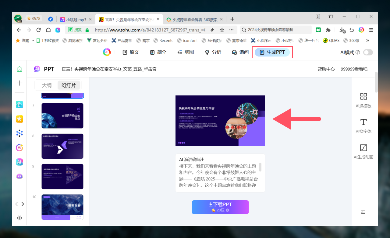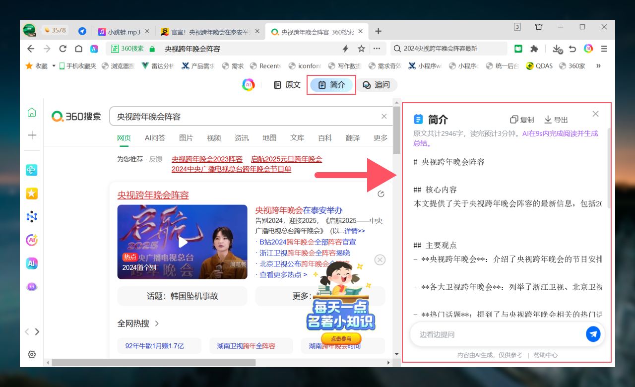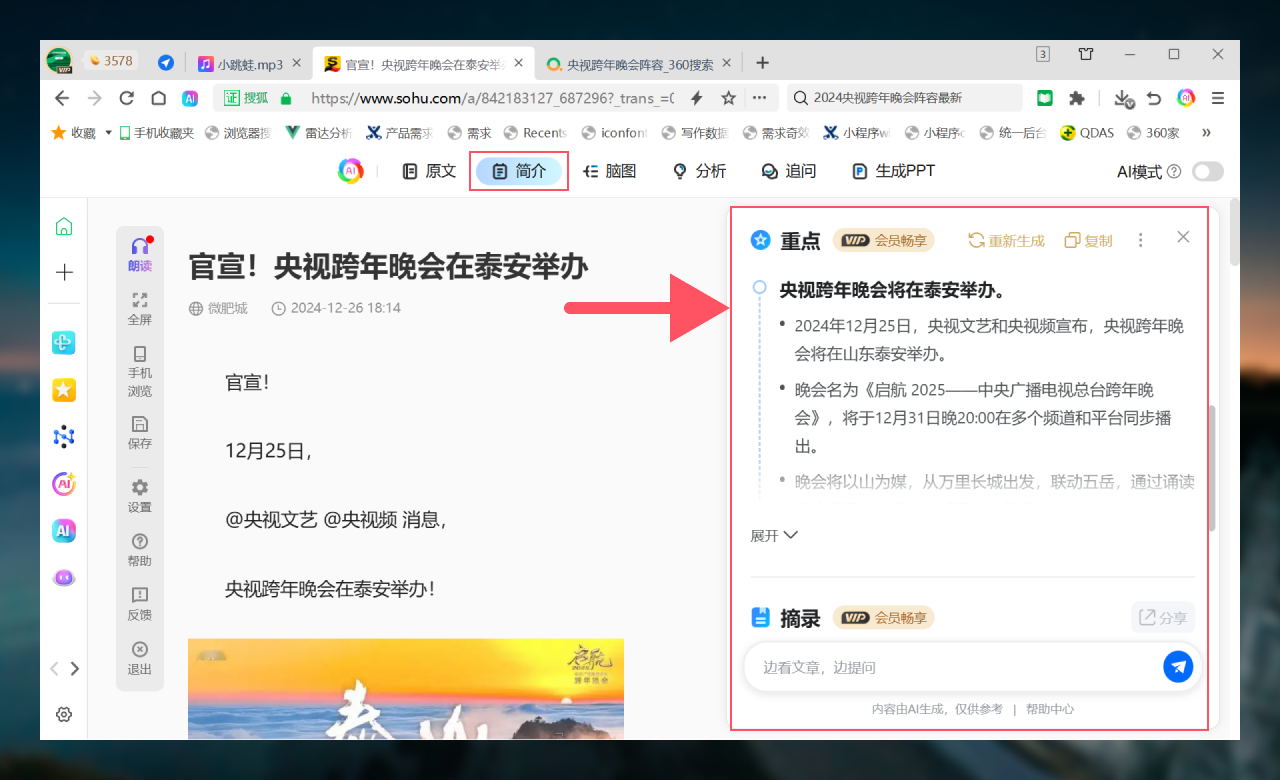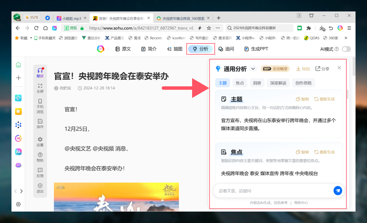 网页进入阅读模式后,支持简介、脑图、重点、分析、追问、生成PPT等6项AI能力。