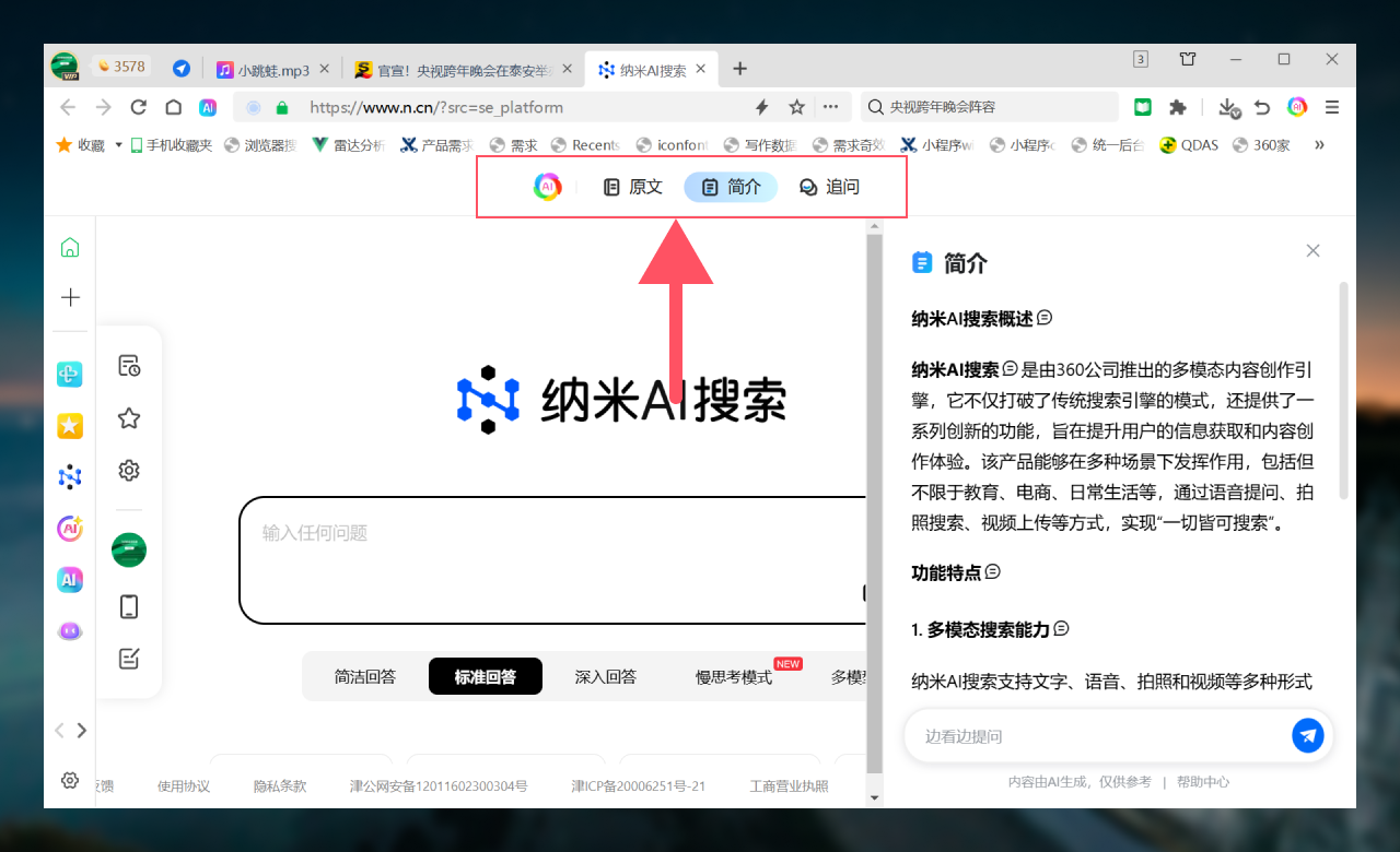 打开网页,支持简介、追问等2个能力。