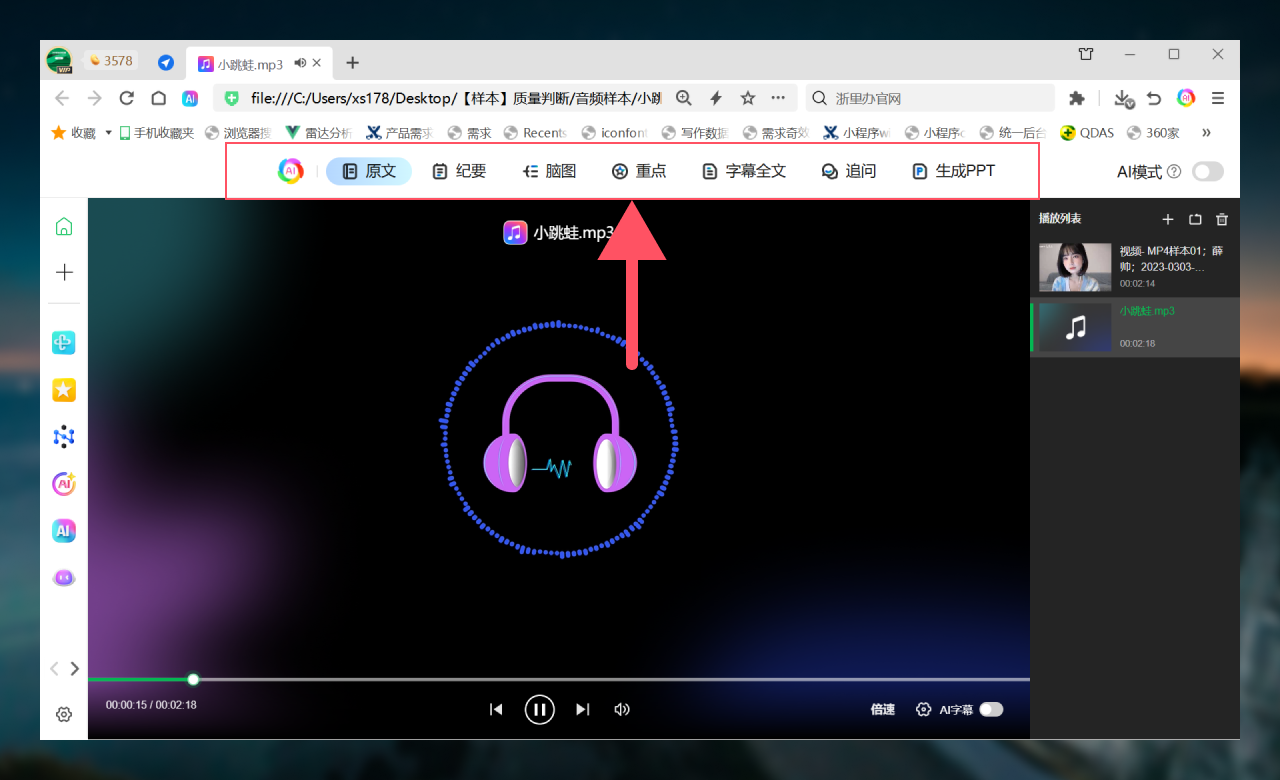 打开本地音频时,支持纪要、脑图、重点、分析、全文、追问、字幕、生成PPT等8项AI能力。