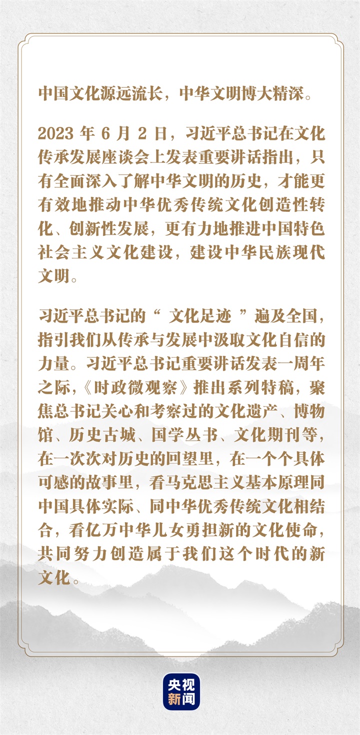 “这段时间,我一直在思考推进中国特色社会主义文化建设、建设中华民族现代文明这个重大问题。”2023年6月2日,在文化传承发展座谈会上,习近平总书记指出,“只有全面深入了解中华文明的历史,才能更有效地推动中华优秀传统文化创造性转化、创新性发展,更有力地推进中国特色社会主义文化建设,建设中华民族现代文明。”