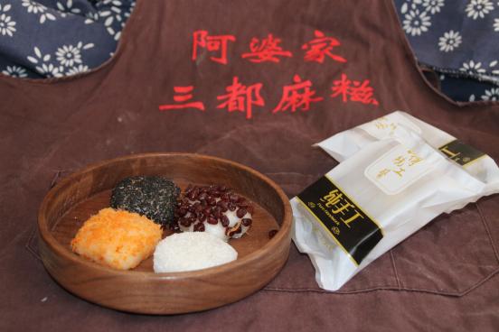阿婆家四喜麻糍,在原有的基础上进行口味的创新,让顾客体验不同口味的麻糍。海苔肉松馅、椒盐百果、绵柔蜜豆馅、芝麻馅4种口味4种颜色,故称四喜麻糍。