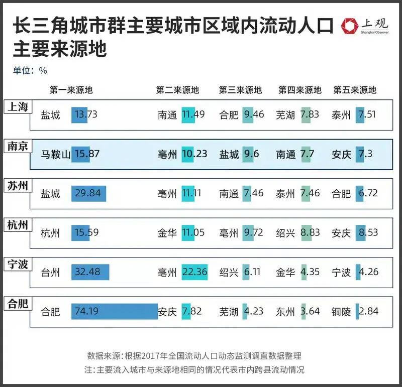 根据2017年全国流动人口动态监测调查数据,长三角范围内,南京流动人口的第一来源地并非本省城市,而是安徽省的马鞍山。并且,南京流入人口的第二来源地、第五来源地也分别是亳州、安庆等安徽城市。