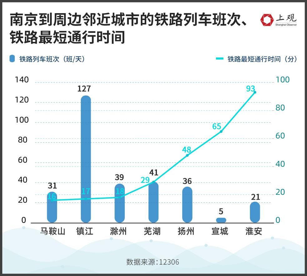 从铁路列车的班次数量看,南京与镇江之间的列车班次最多,其次就是芜湖、滁州等安徽城市。