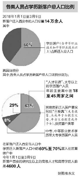 西安市公安局治安局户政处统计数据表明,2018年1月1日至2月底,市外迁入共9万余人,其中硕士研究生以上3000多人,本科3万余人,人才引进2000多人。
