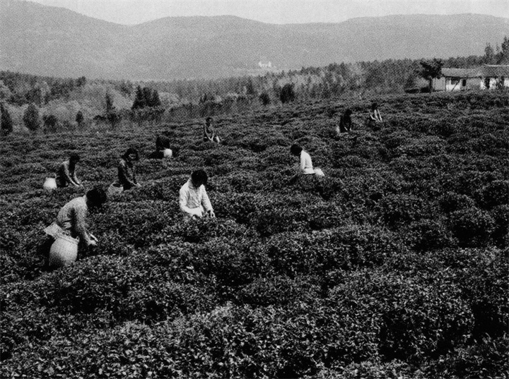 1959年春天,南京中山陵园茶厂开始采制新品种名产“雨花茶”,外形像松针,炒制采用搓条和拉条手法,味道清香,外形美观。图为茶厂职工在精心采摘新茶。陈哲摄