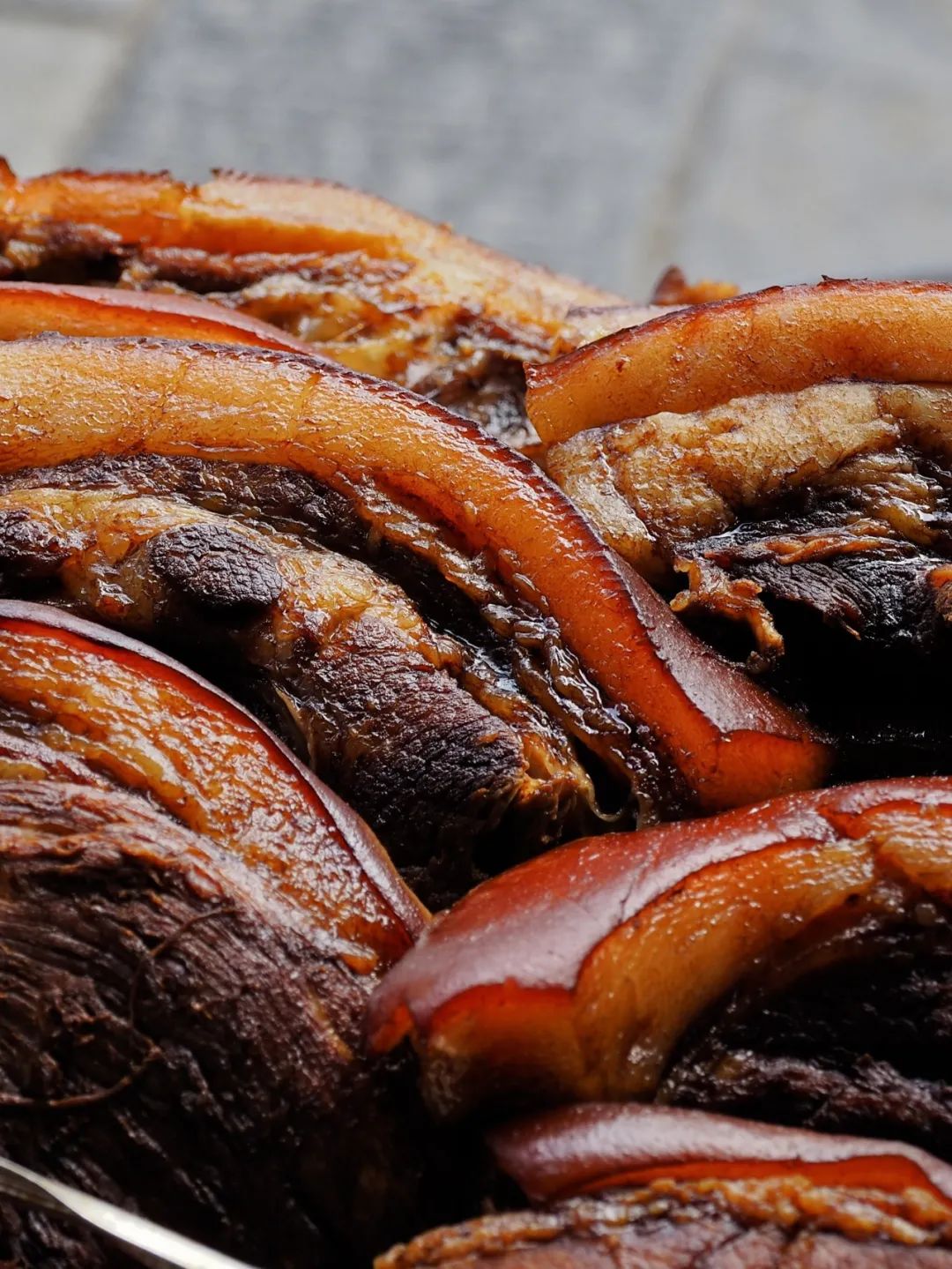 选好的肉不加姜葱、料酒,也不用加糖调色,只需用几味中草药及香料出味。传统做法要一夜才能做好——前半夜煮,后半夜闷,中间必须有人守着照顾火候。等到天光大亮,这锅腊汁肉才算是正式煮好了。看一眼色亮红润,尝一口软烂醇香,肥肉不腻、瘦肉不柴、脂浓味美。