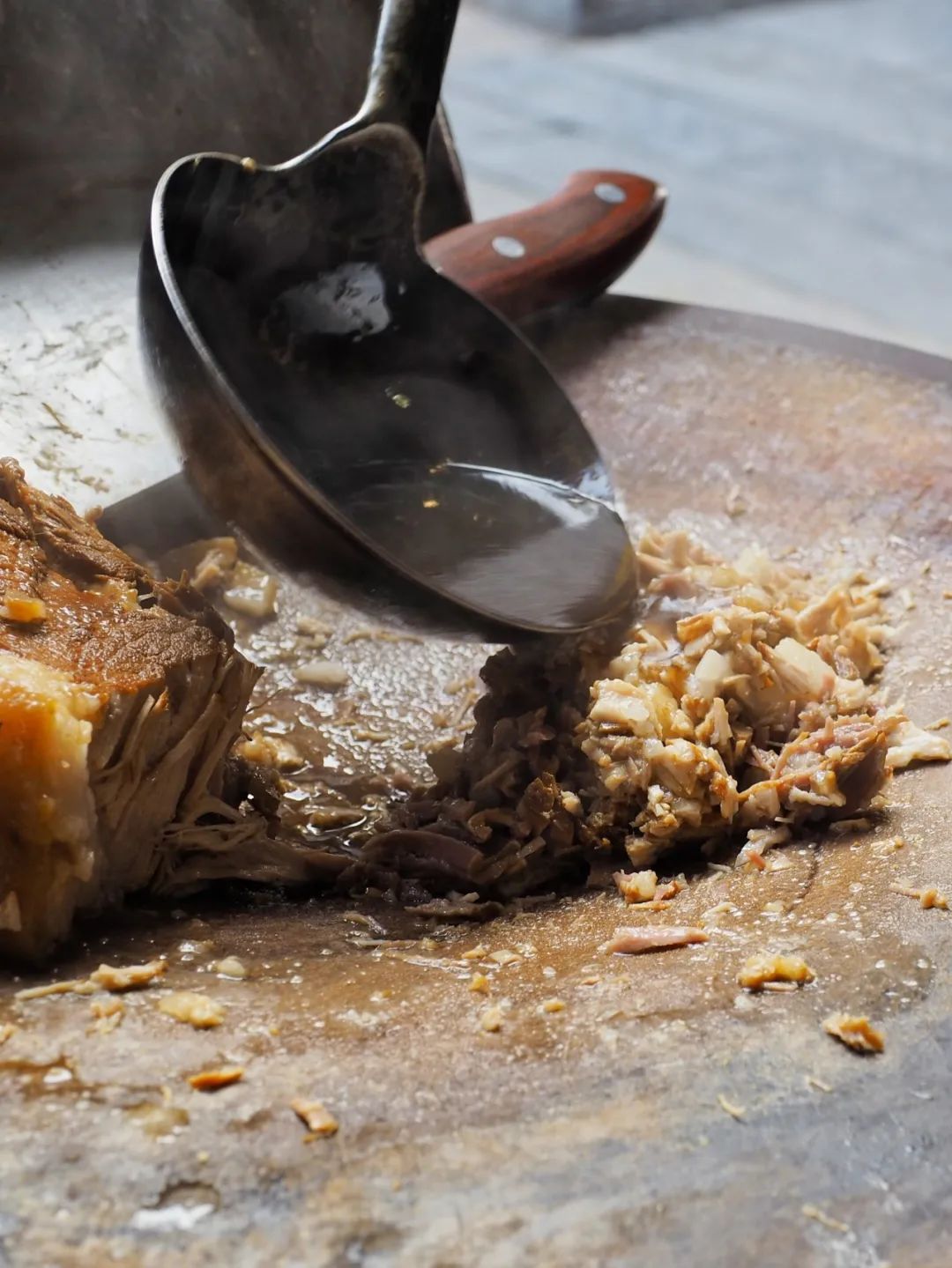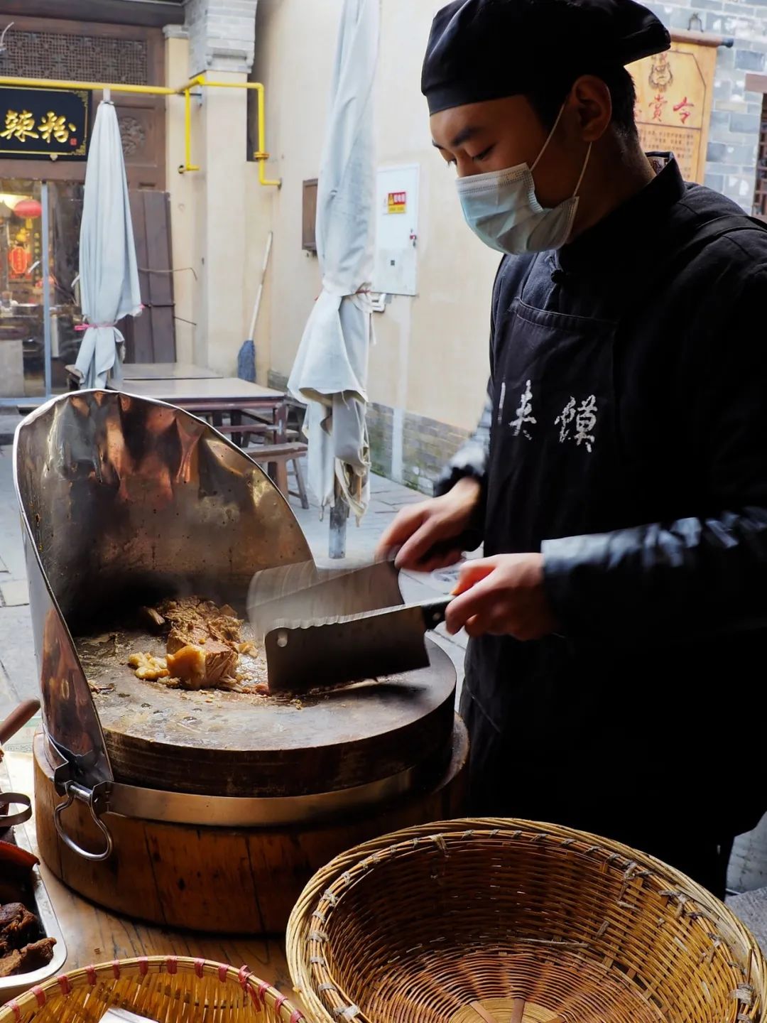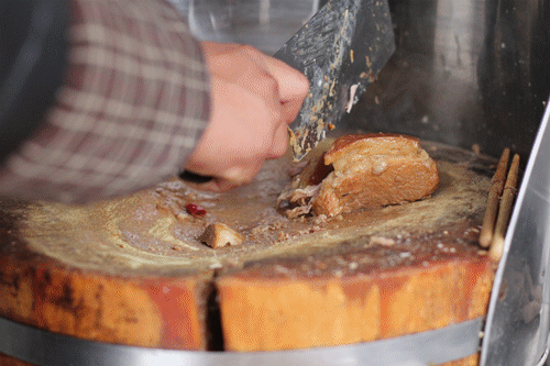 熬好的腊汁肉就等着被捞出来,剁成肉粒装入馍中了。如果想选一家肉最“扎实”的店,就看准一家剁肉砧板已被剁下去一个豁子的,那里的肉准没错。